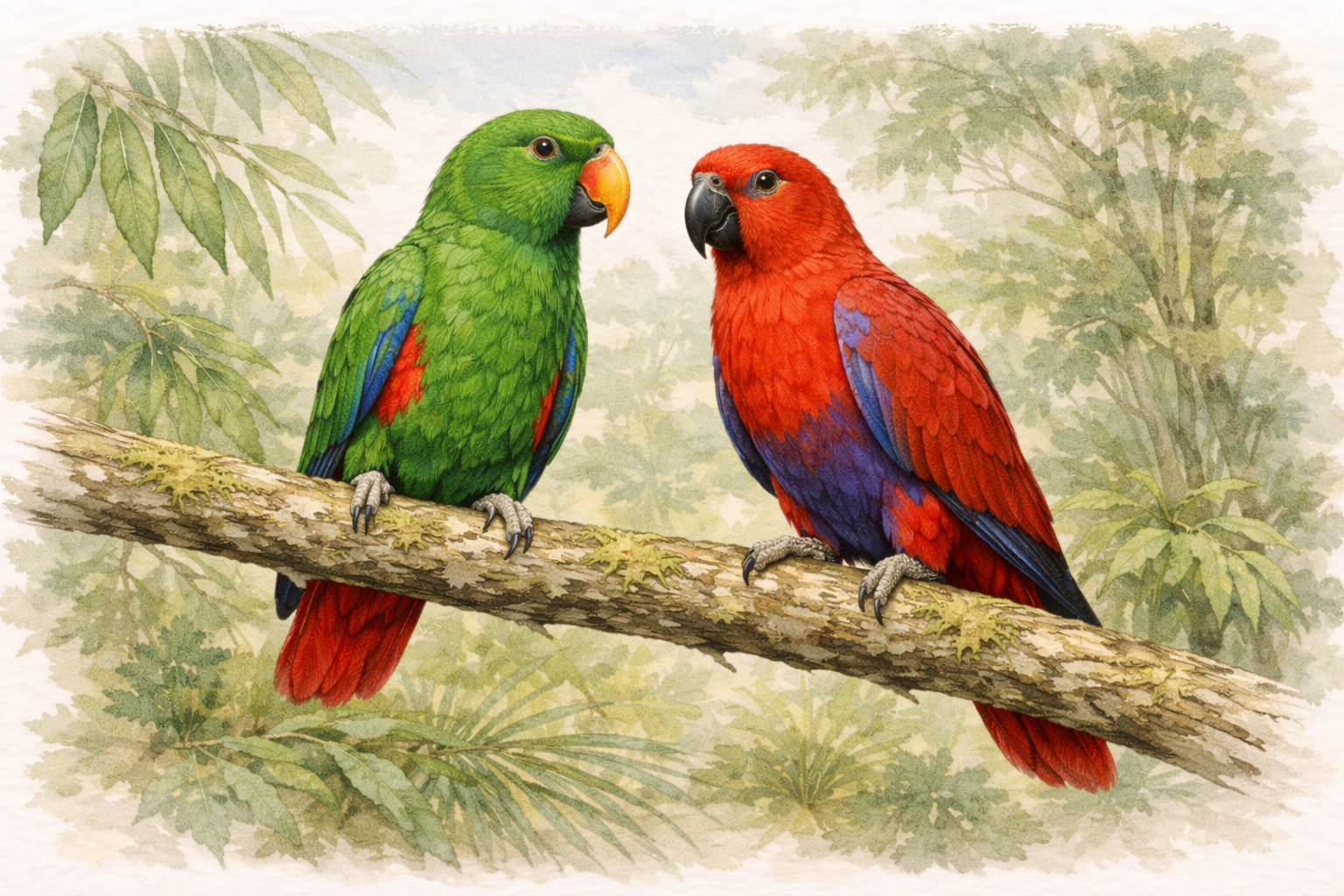 Ädelpapegojan är speciell eftersom hona och hane ser helt olika ut.