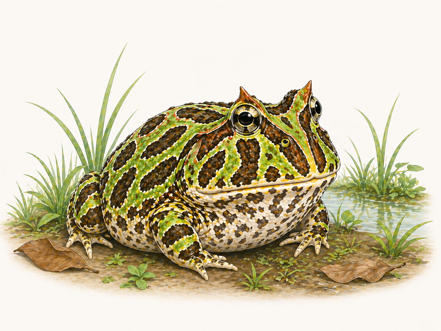 Den argentinska hornpaddan är en kraftig groda som är känd för sin stora mun och sitt glupska beteende. Den har ett mönstrat utseende i gröna och bruna nyanser som gör att den smälter in perfekt i sin omgivning. Trots sitt lugna yttre är den en effektiv jägare.