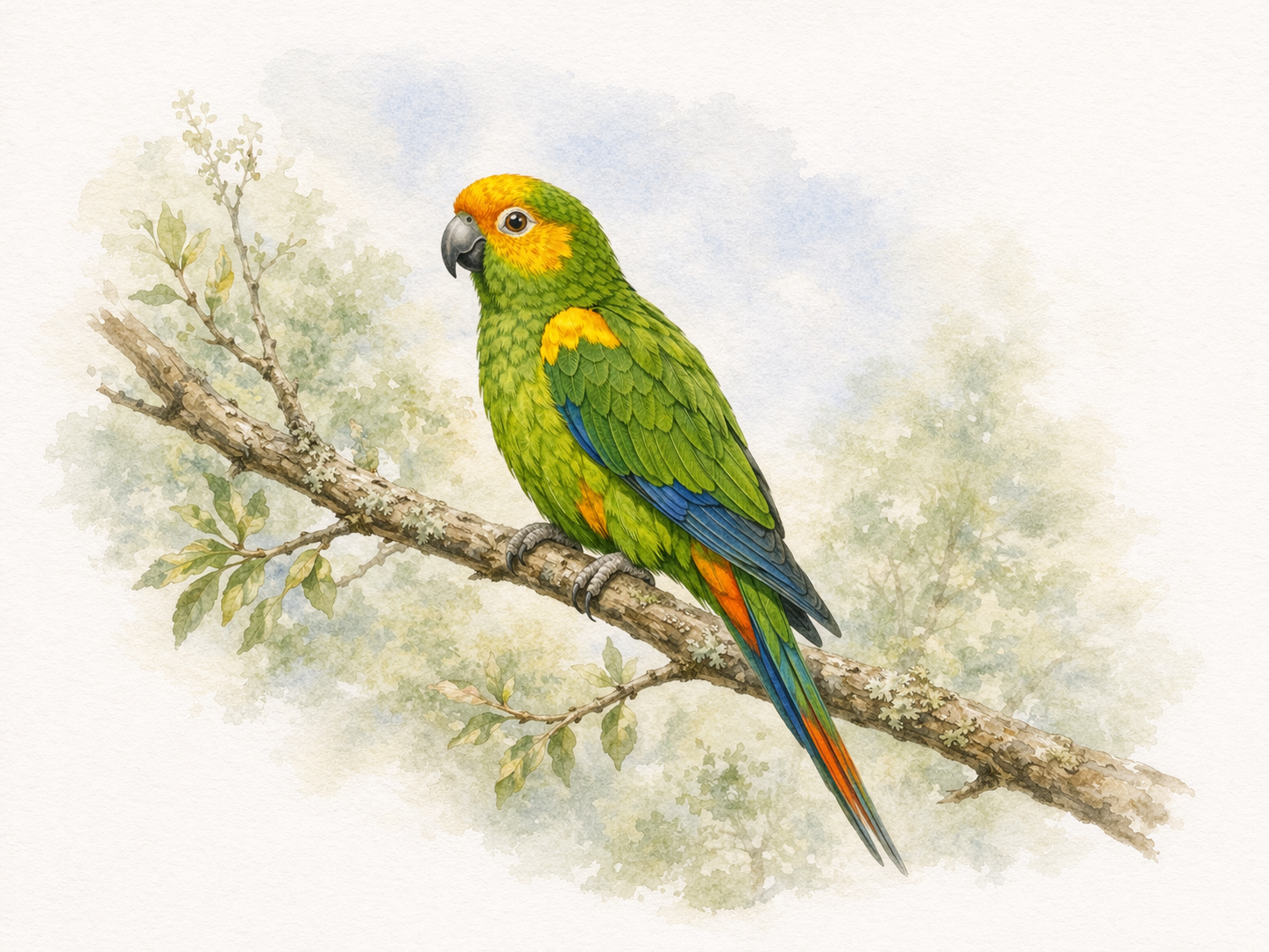 Halvmåneparakiten är en liten till medelstor papegoja som känns igen på sina gröna fjädrar och sin orange-gula panna som bildar en halvmåneform. Den är aktiv, social och ofta högljudd, och rör sig gärna i flockar.