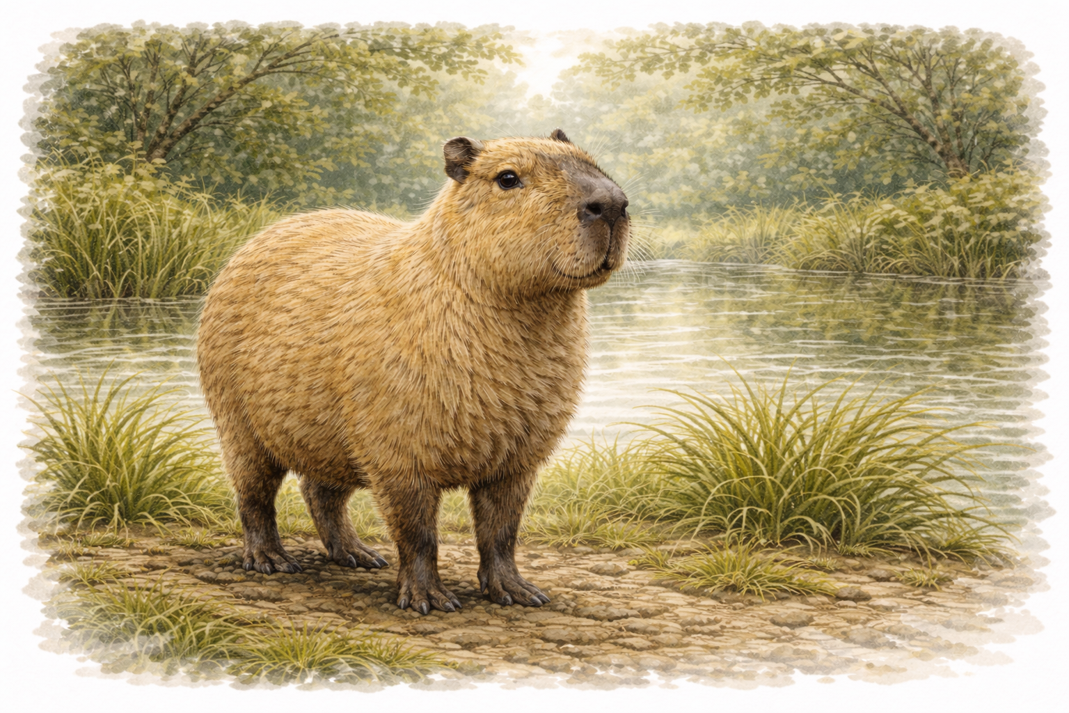 Kapybaran är världens största gnagare och är känd för sitt lugna och sociala temperament. Den lever i flockar nära vatten och är en skicklig simmare. Med sitt vänliga uttryck och sitt avslappnade beteende har kapybaran blivit ett av de mest omtyckta djuren i många djurparker