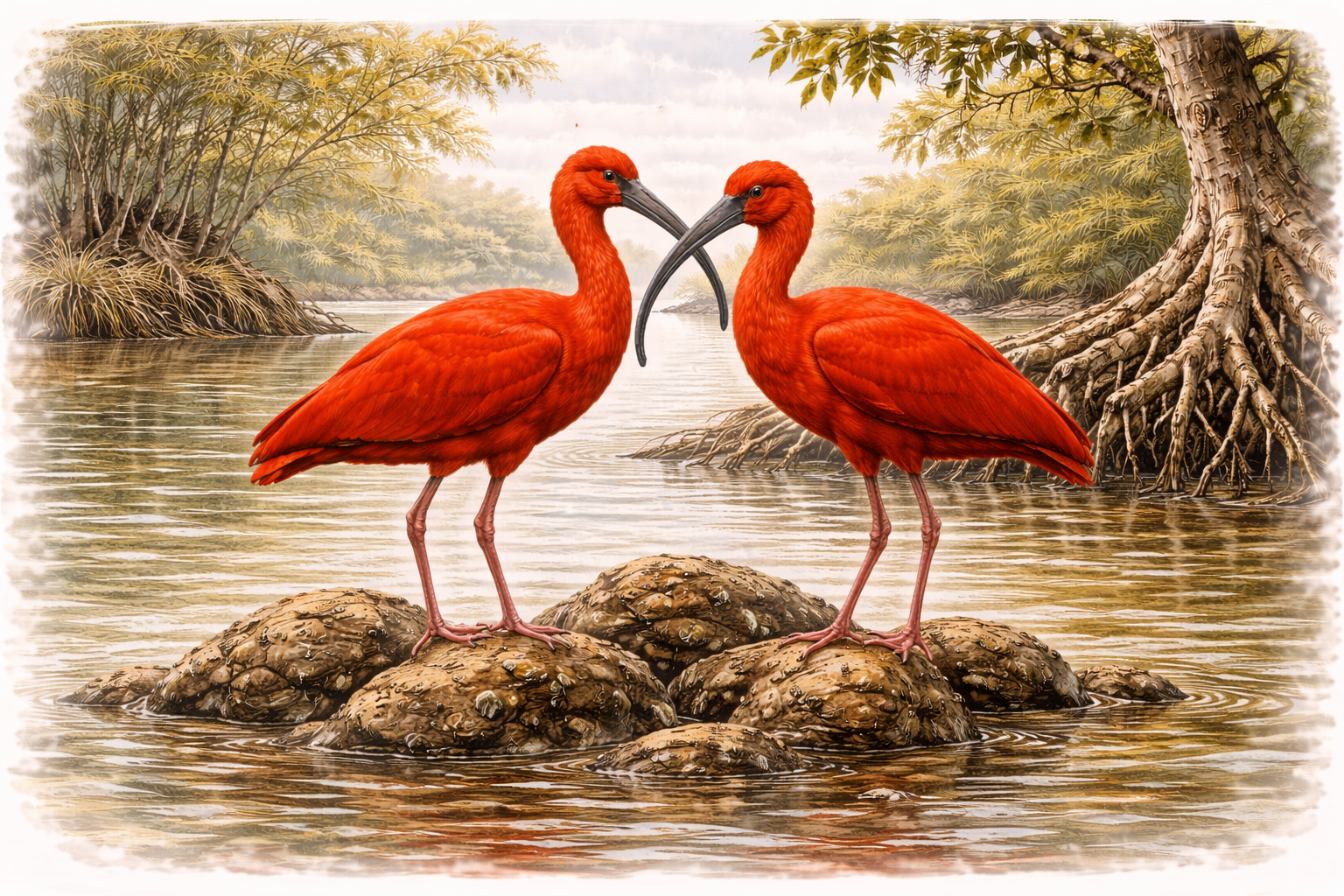 Den röda ibisen är en spektakulär fågel med sin starkt röda fjäderdräkt. Färgen gör den till en av de mest iögonfallande fåglarna i världen. Den lever i flockar och rör sig ofta tillsammans i våtmarker där den söker efter föda.