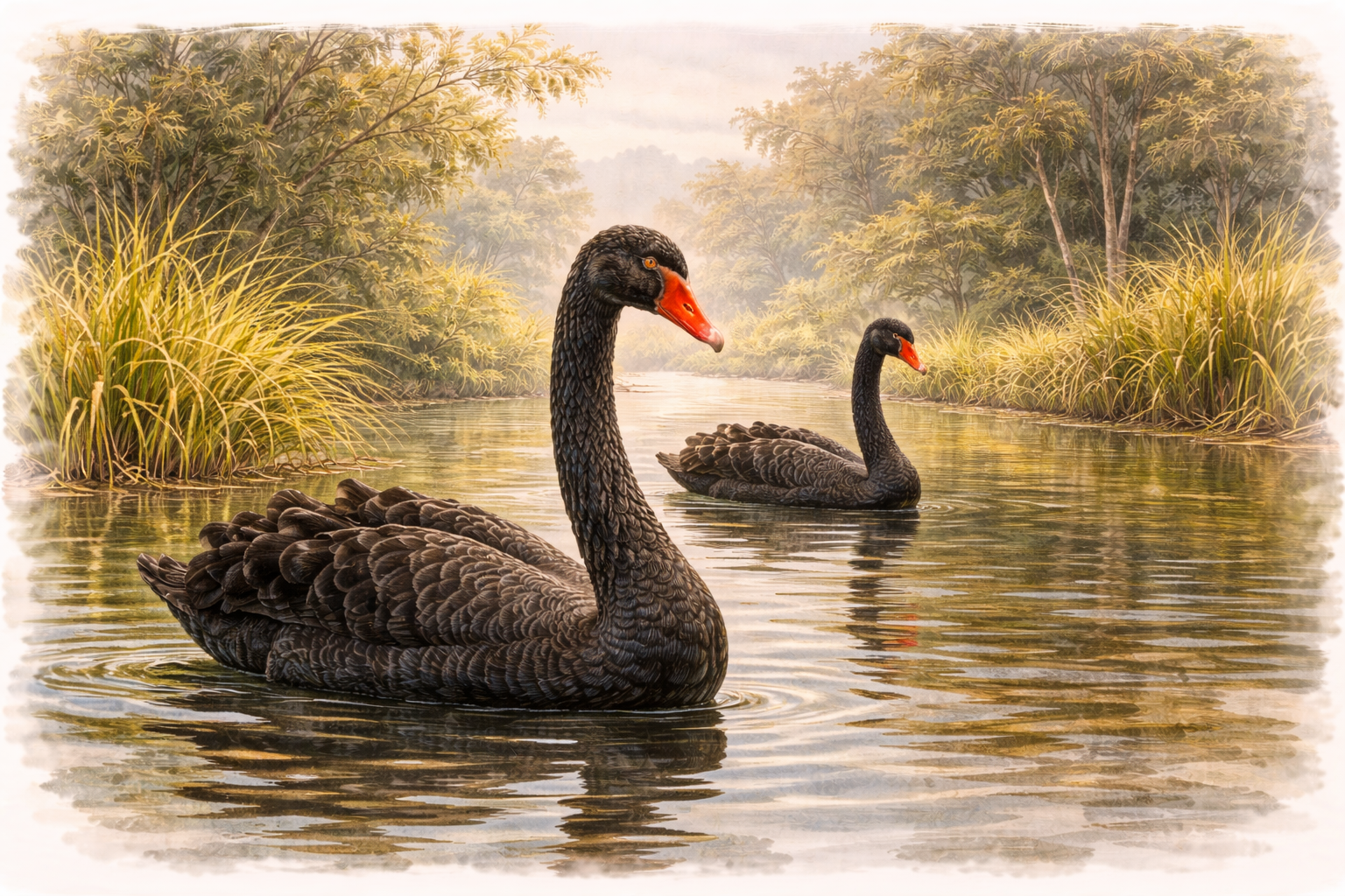 Den svarta svanen är en stor och elegant fågel som skiljer sig från andra svanar genom sin svarta fjäderdräkt. Den har en lång hals och en röd näbb med ljus spets. Med sitt lugna rörelsemönster och sitt vackra utseende är den en imponerande syn vid vatten.