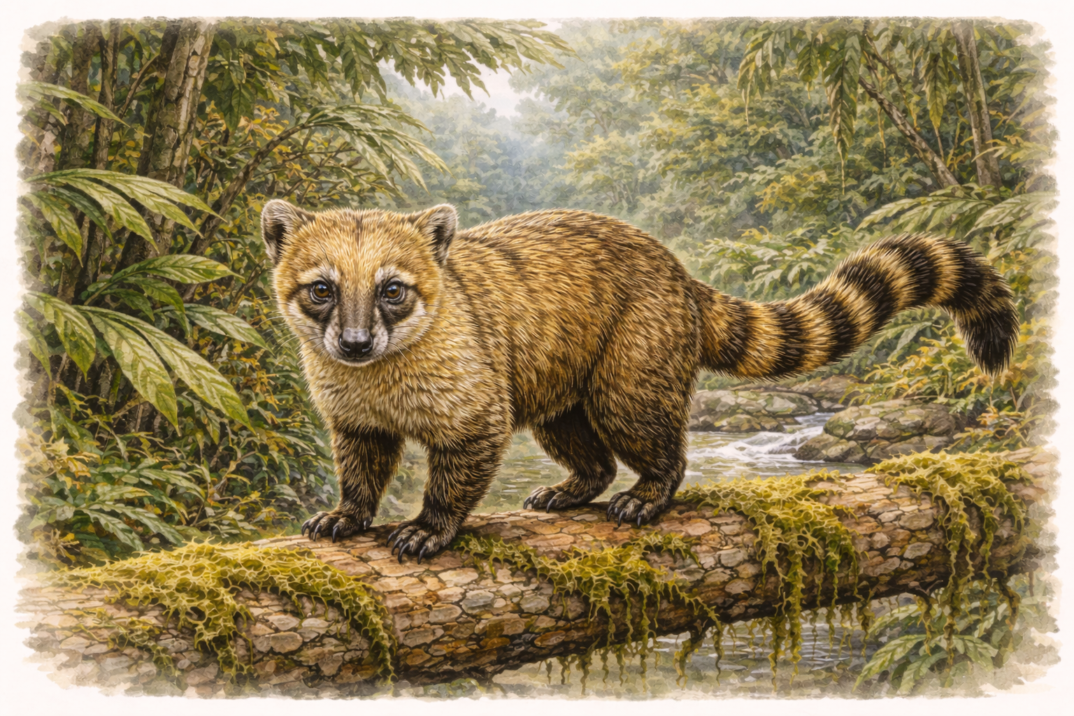 Den har lång nos, randig svans och ett nyfiket beteende.
